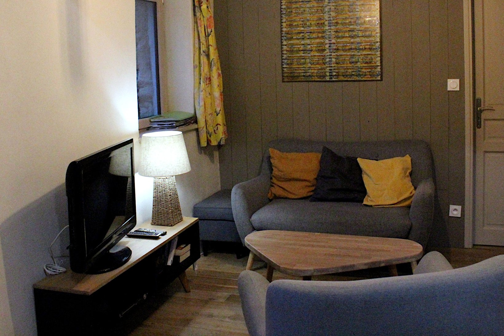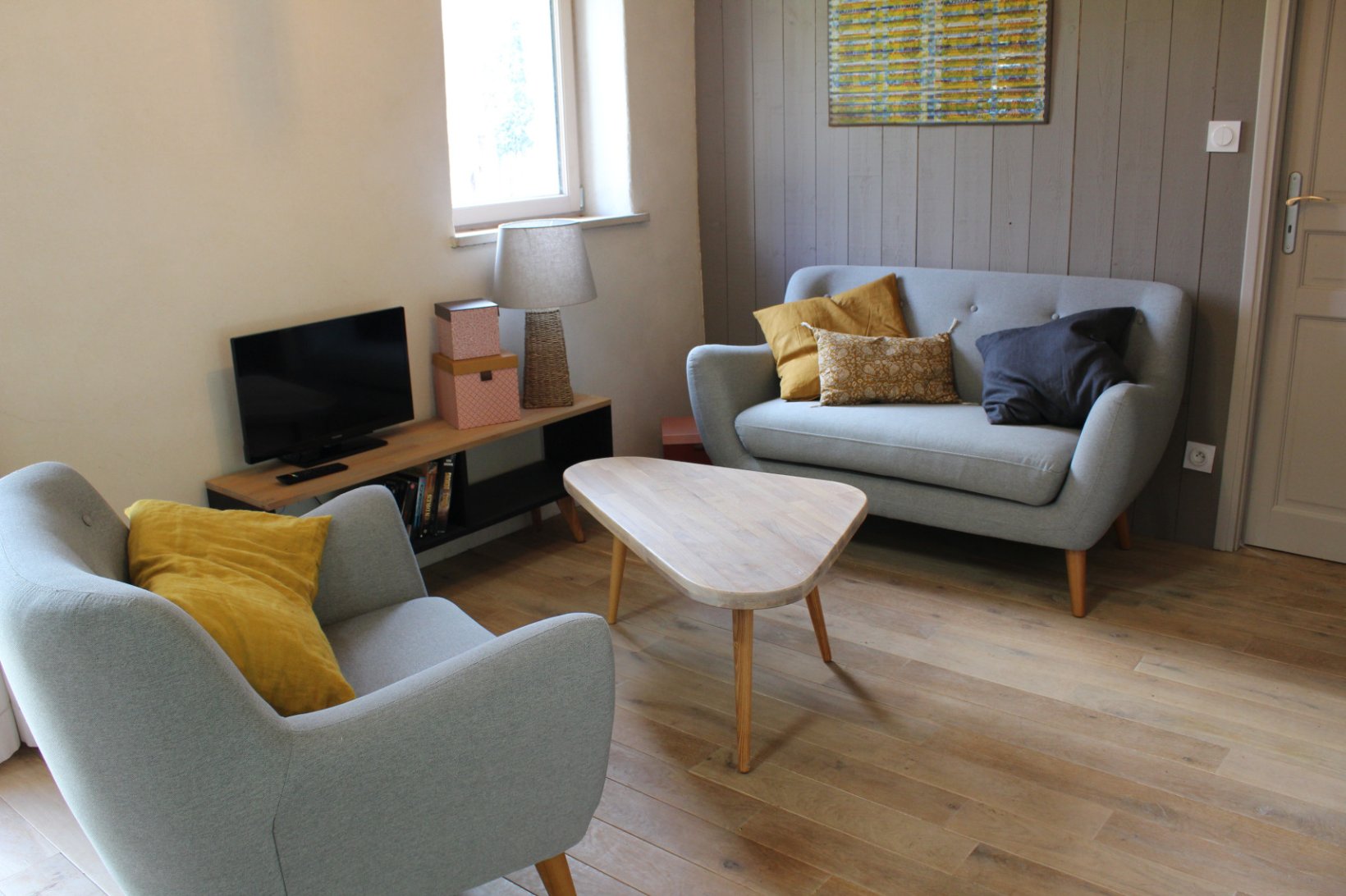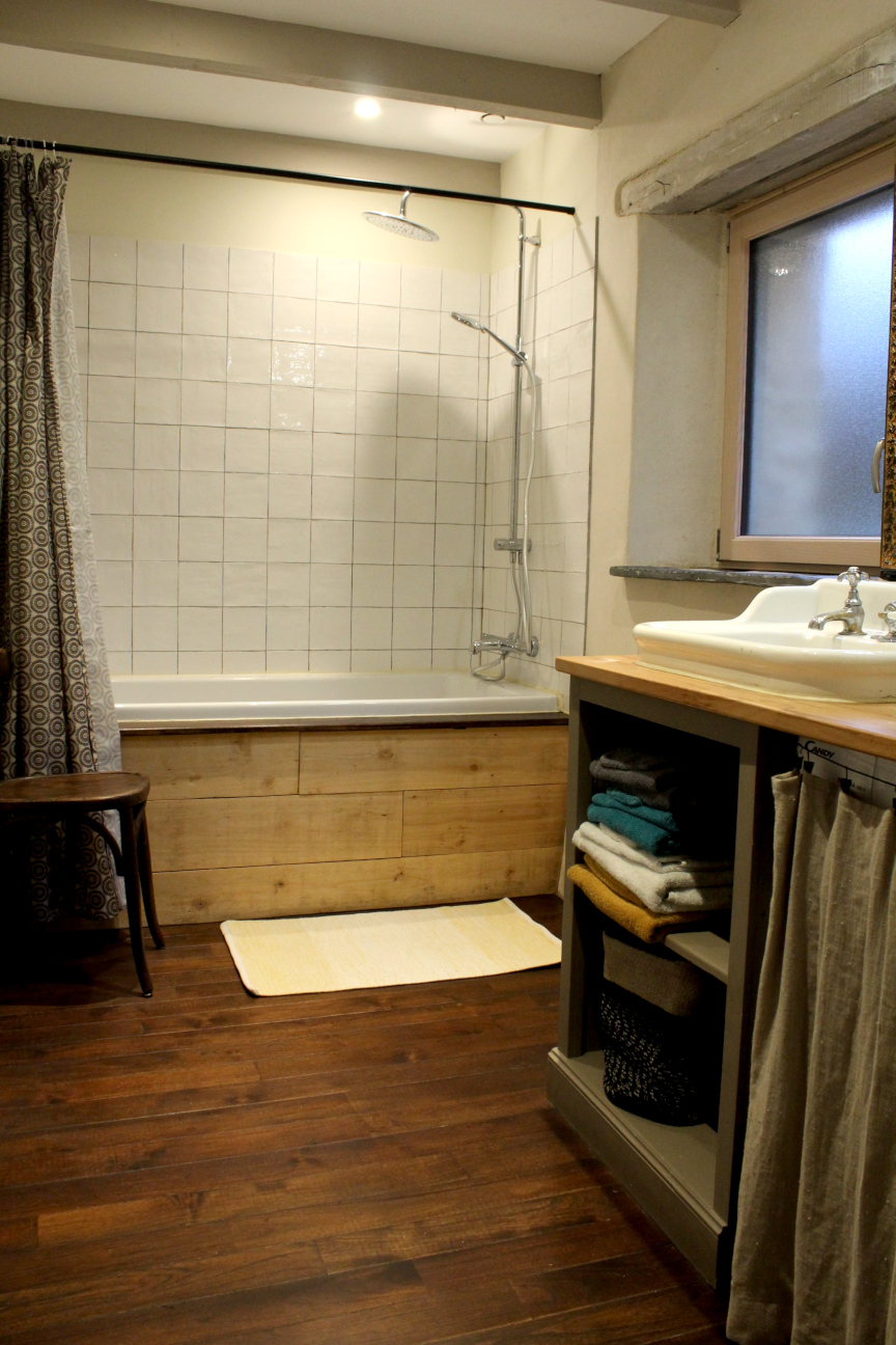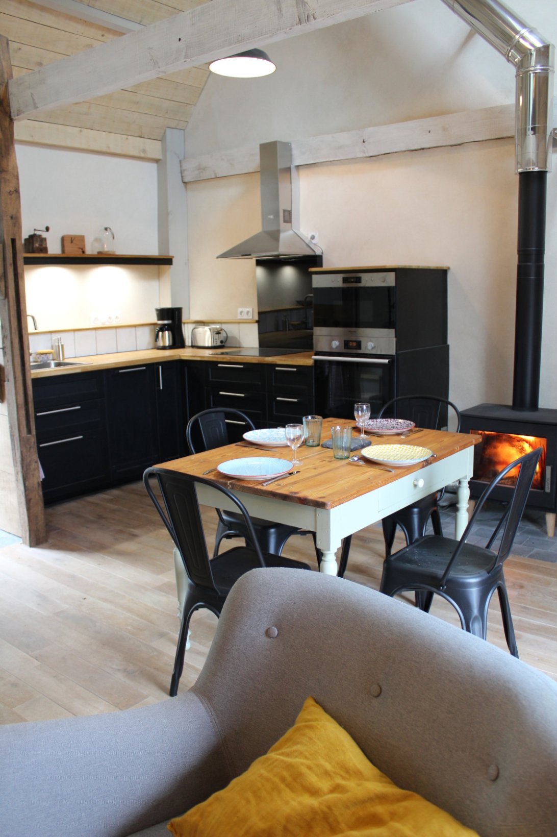 Des matériaux clairs et naturels, des poutres apparentes, du bois et de la chaux, un poêle pour les soirées un peu fraîches, deux grandes chambres confortables...