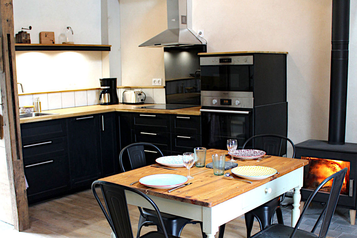 La cuisine invite à préparer de bons petits plats, avec son aménagement pratique et chaleureux. Que ce soit pour confectionner des petits plats ou prendre le petit déjeuner, vous trouverez ici des ustensiles de cuisine & cuisson complets, récents et en bon état (poêles, cocotte, casseroles, petit mixer, plats à four, bouilloire, essoreuse à salade...). La vaisselle est également complète, assortie et récente pour un séjour de 4 personnes.
